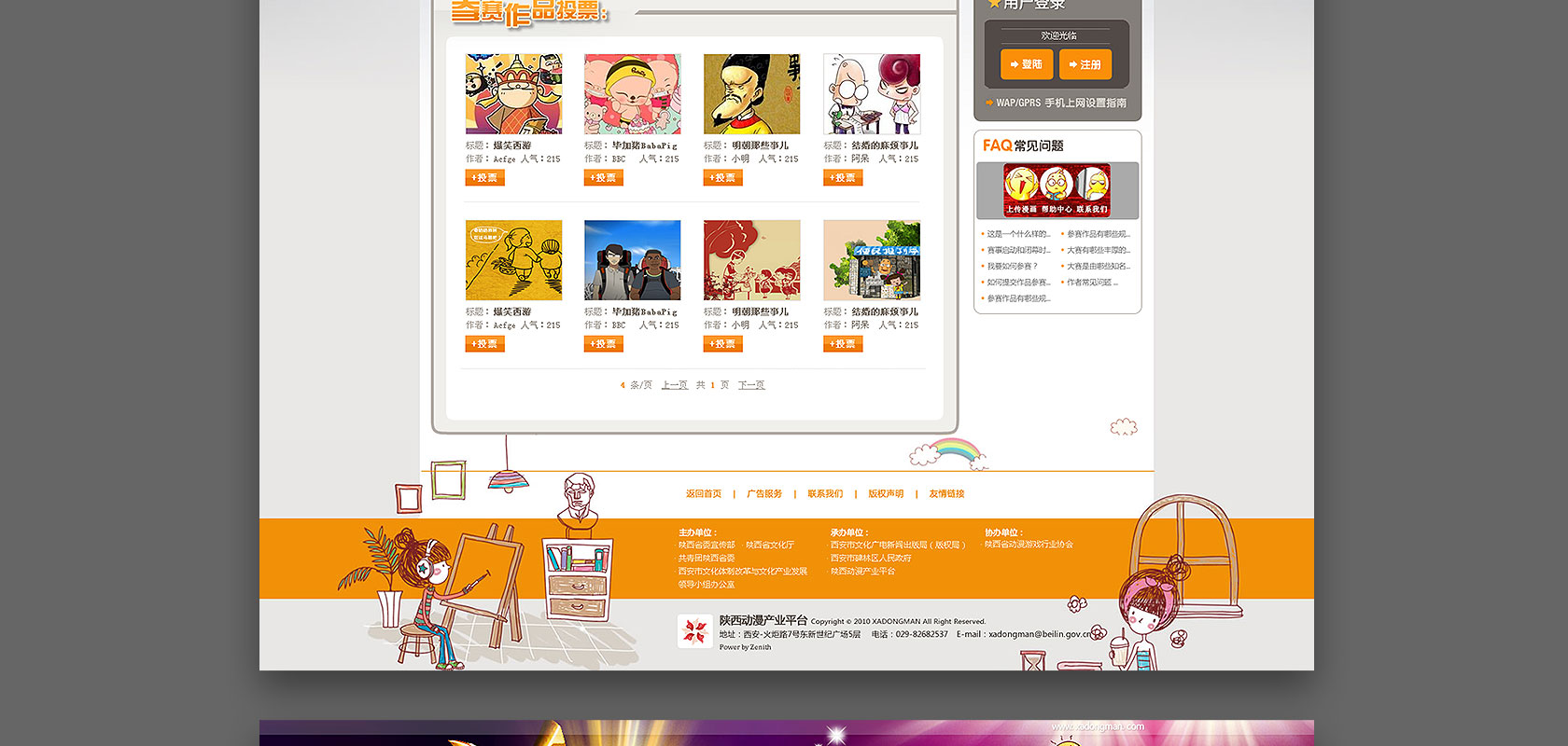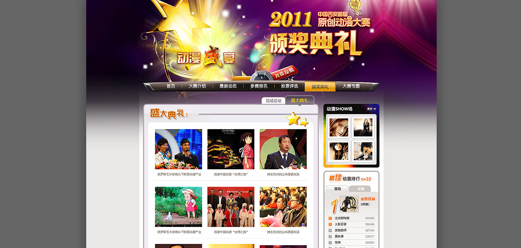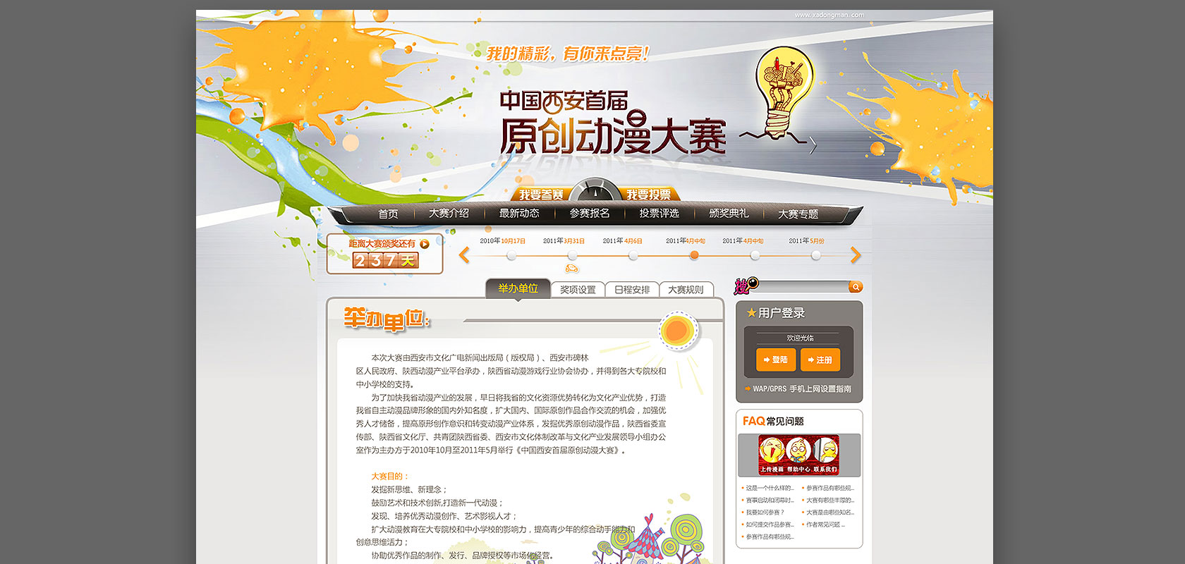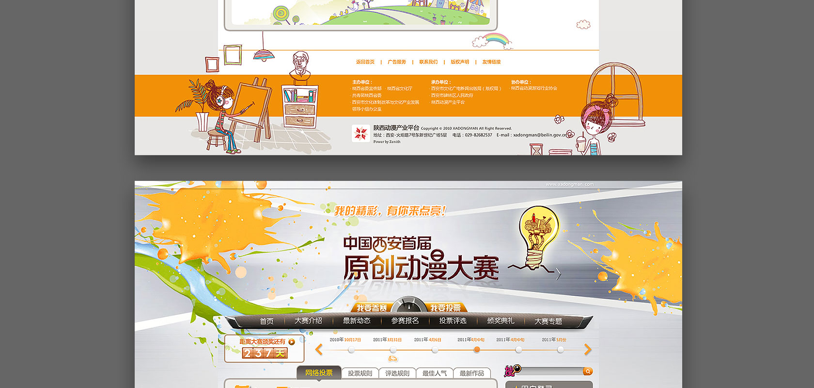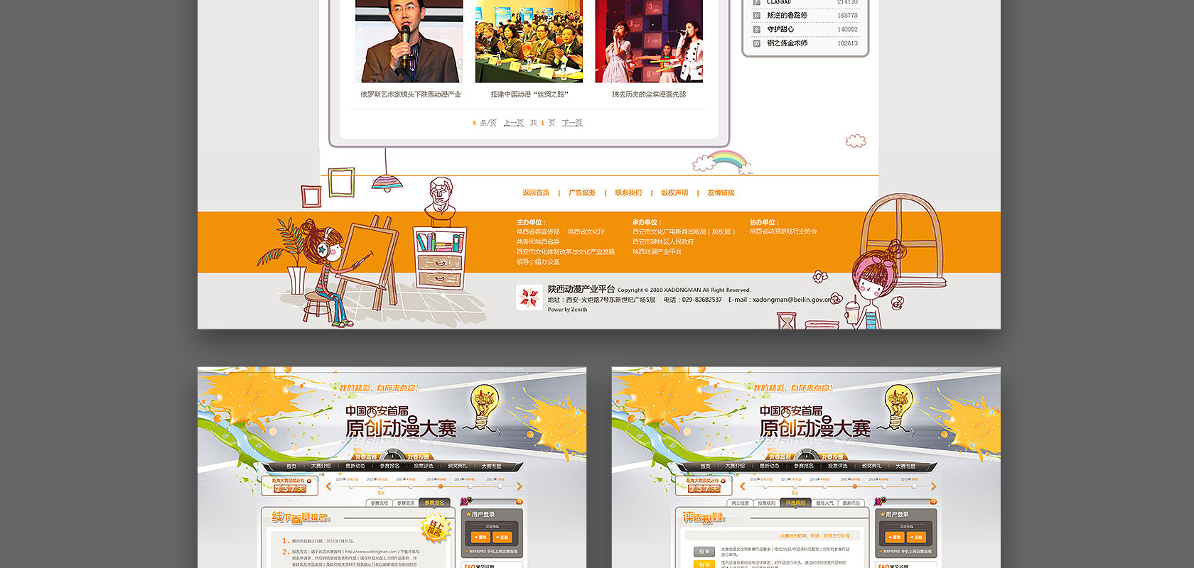 西安首届原创动漫大赛官方网站集中了多个优秀的动漫作品,形象创意个性易于识别,导航清晰,功能性难度高的优秀的赛事展播窗口。作为互动交互展示平台,自由、轻松、青春、活泼、张扬的造型,靓丽、漂亮、阳光、丰富的色彩,体现整个赛事的传播平台的氛围。